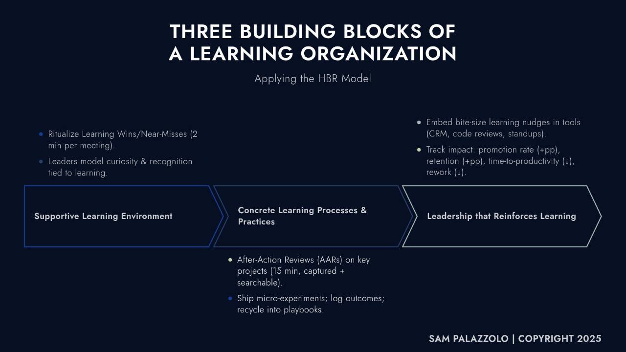 In their widely cited Harvard Business Review article Is Yours a Learning Organization? David Garvin, Amy Edmondson, and Francesca Gino (2008) outlined the Three Building Blocks of a Learning Organization. This framework remains one of the most effective tools for leaders seeking to hardwire learning into culture and operations.