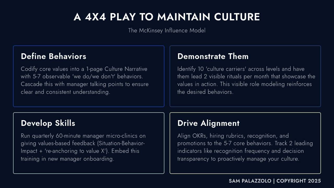 The implications are clear. Maintaining culture is not about slogans, perks, or one-off events—it is about consistently reinforcing behaviors through leaders, systems, and structures. The challenge is execution: how do leaders scale something as nuanced and intangible as “culture” across increasingly complex organizations?