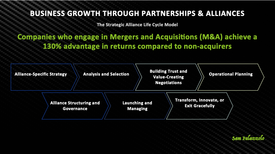 Companies that engage in Mergers & Acquisitions (M&A) see a 130% advantage in returns over non-acquirers. But beyond M&A, structured partnerships increase revenue, lower costs, and enhance innovation by leveraging shared strengths.