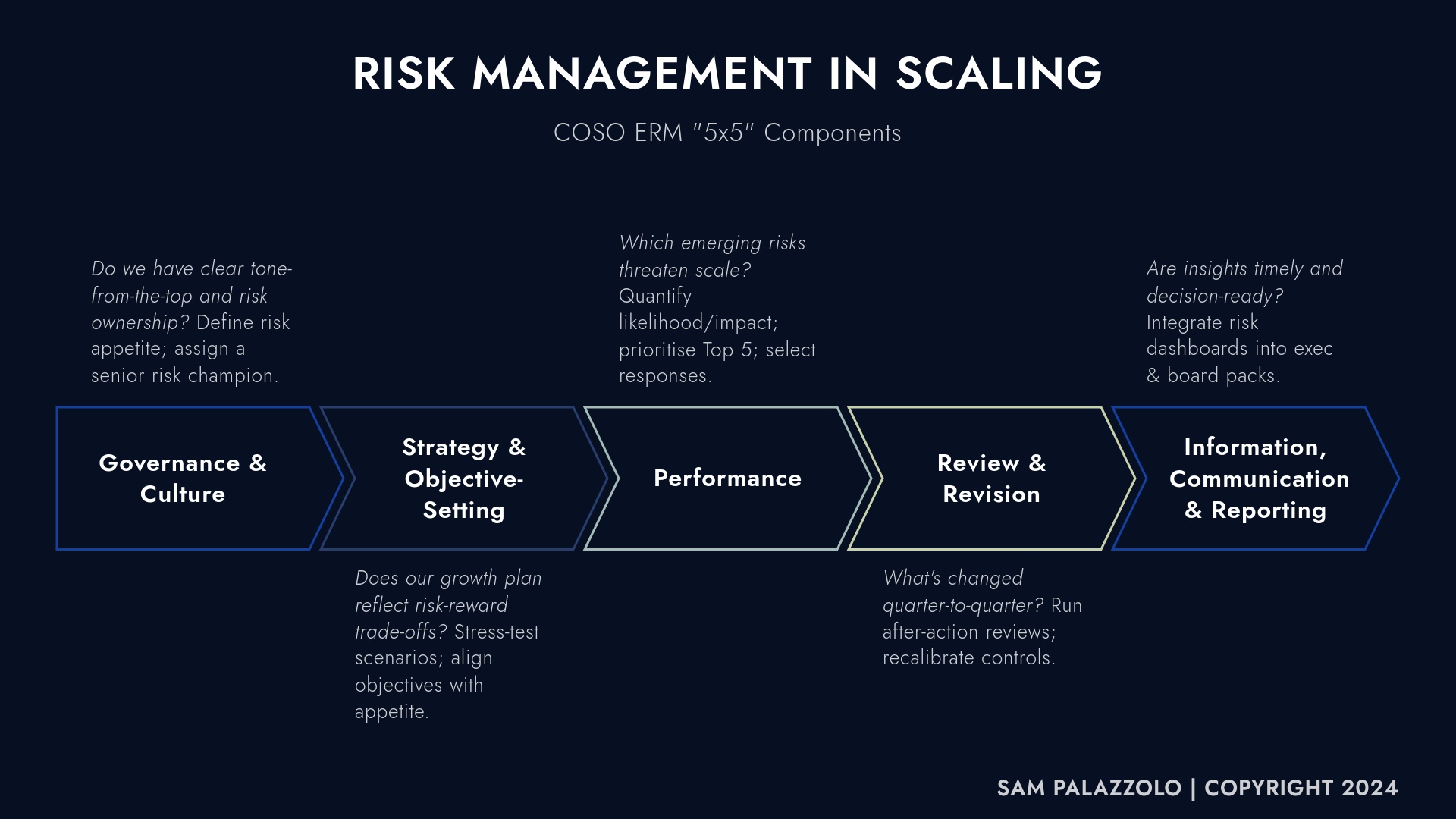 Speed without control courts disaster. The COSO ERM “5×5” Framework turns risk management from a compliance cost into an accelerant by wiring five mutually reinforcing components straight into the growth engine.