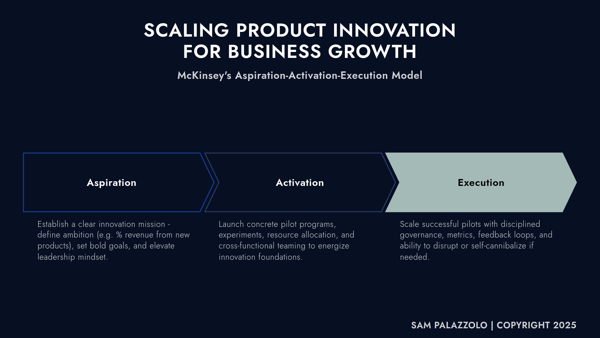 For leaders ready to turn innovation into a real growth engine, McKinsey’s Aspiration–Activation–Execution model offers a way forward: