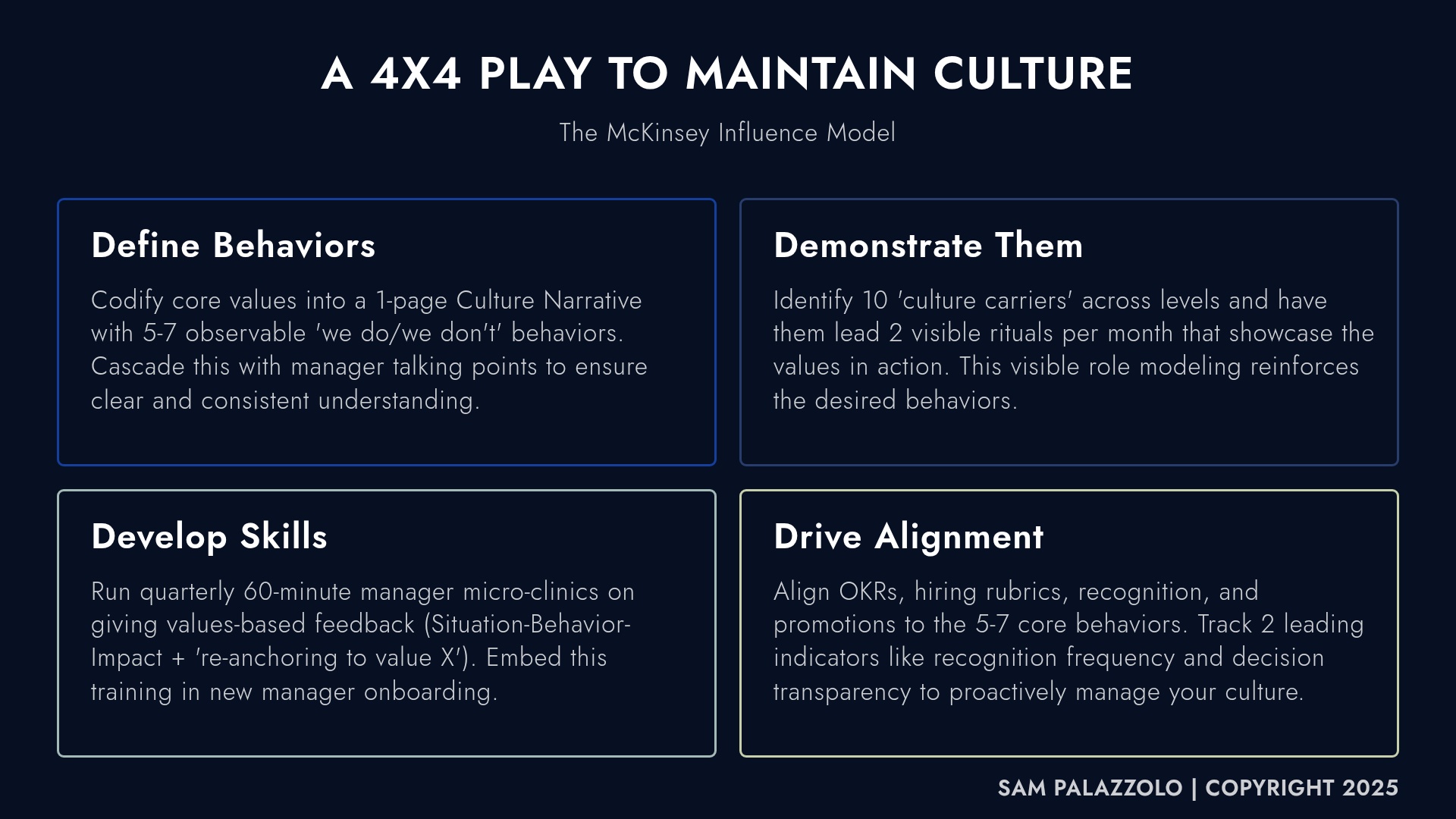 To maintain culture at scale, you need a mechanism that converts intent into everyday behavior. The most battle-tested mechanism I’ve found is McKinsey’s Influence Model—four levers that shift mindsets and actions: